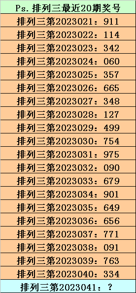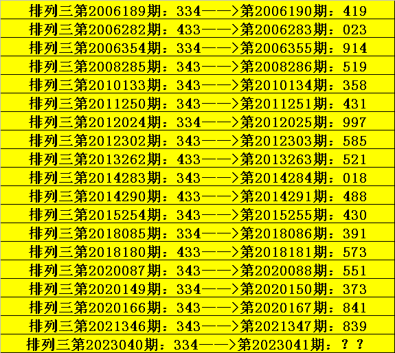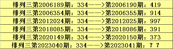 第2023040期成列三奖号为334,历史上该号码组选开出19次,下期奖号诀别为:419、023、914、519、358、431、997、585、521、018、488、430、391、573、551、373、841、839。