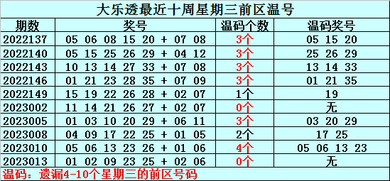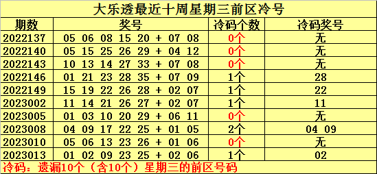 热号:最近十周星期三前区开出22个热号,上周星期三前区开出4个热号,本周星期三正式热号03 23。